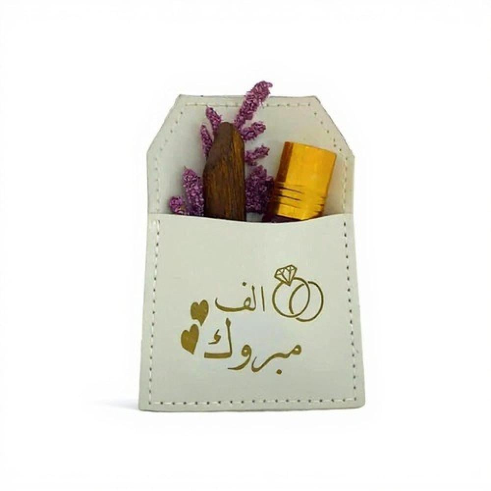 درزن(12 قطعة) من جيوب الجلد لون بيج بالإضافة إلى تولة مسك وكسرة عود ومنسق بالورد وعبارة ألف مبروك