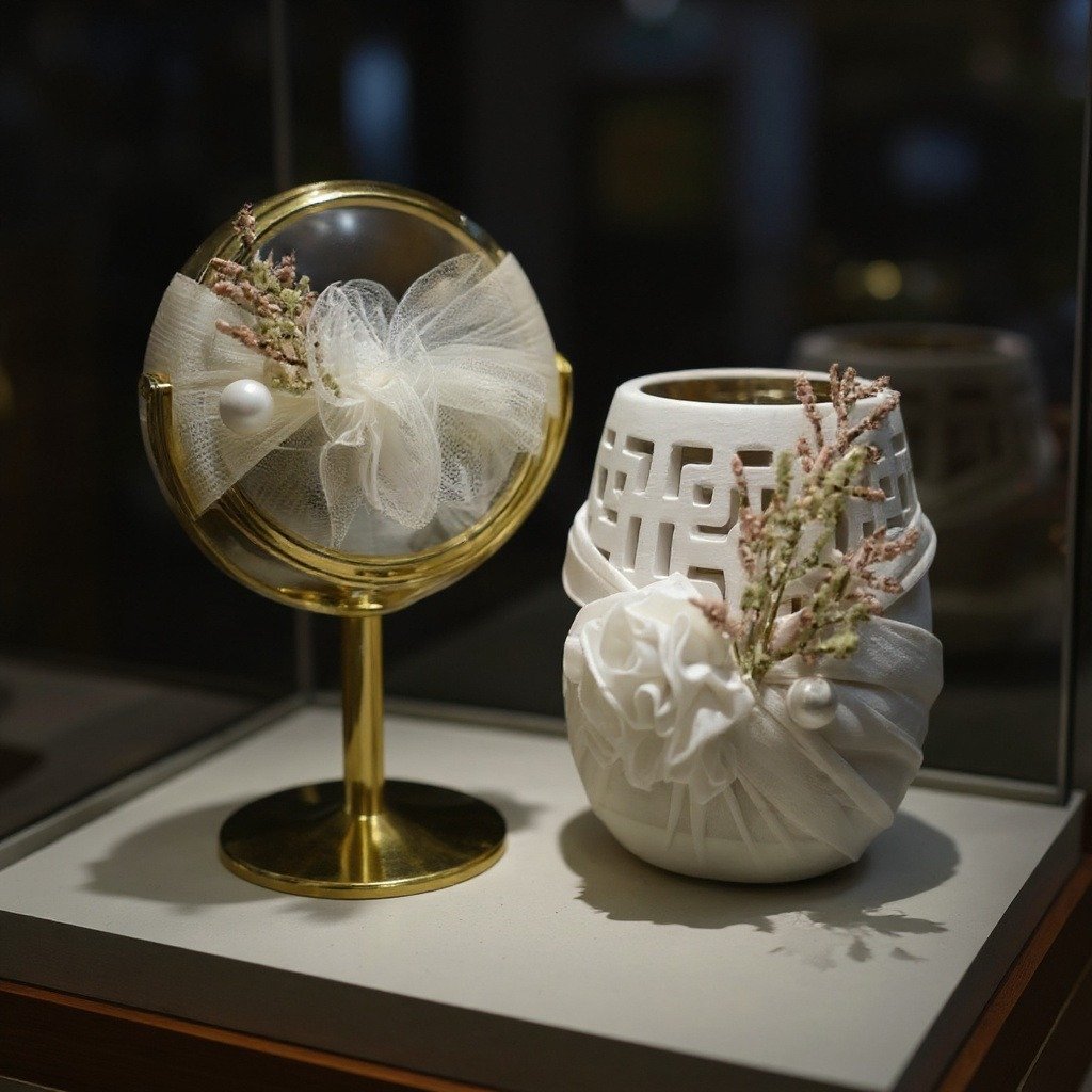 - تنسيق فاخر بالأسلوب الياباني مع الورد المجفف واللؤلؤ لإضفاء لمسة راقية.
